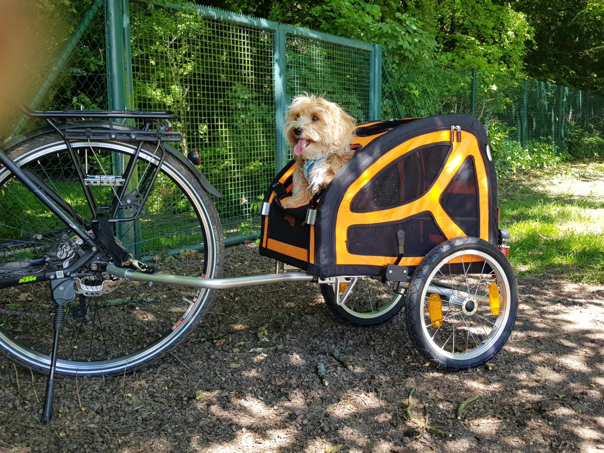 - in seinen ersten Fahrradanhänger mit einer für Havaneser empfohlenen Größe passt er nicht mehr rein; zu lang, zu hoch. Die nächstgrößere Version passt und hat auch noch Luft für ein paar weitere Wachstumsschübe. Ich sollte über ebay Kleinanzeigen nachdenken, um den ersten Anhänger wieder zu verkaufen.