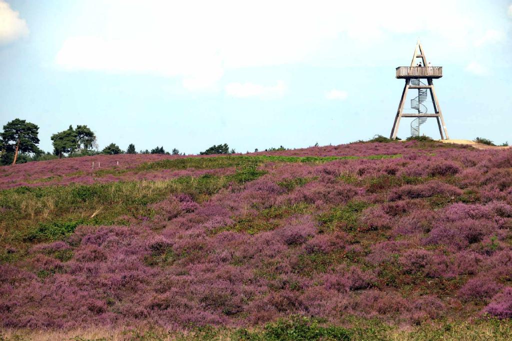 Wirklich schön ist die um diese Jahreszeit blühende Heide. Nein, wir haben den Aussichtsturm nicht bestiegen. Die vielen Treppen sind nicht wirklich hundefreundlich und wir waren auch wenig motiviert, den Havi hoch- und runter zu schleppen. Wir sind da schon glücklich, dass er bei uns zu Hause die Treppe vom Erdgeschoss in die erste Etage mittlerweile eigenständig hoch- UND wieder runterkommt, ohne ihn tragen zu müssen. Mehr Treppe muss erstmal nicht sein.